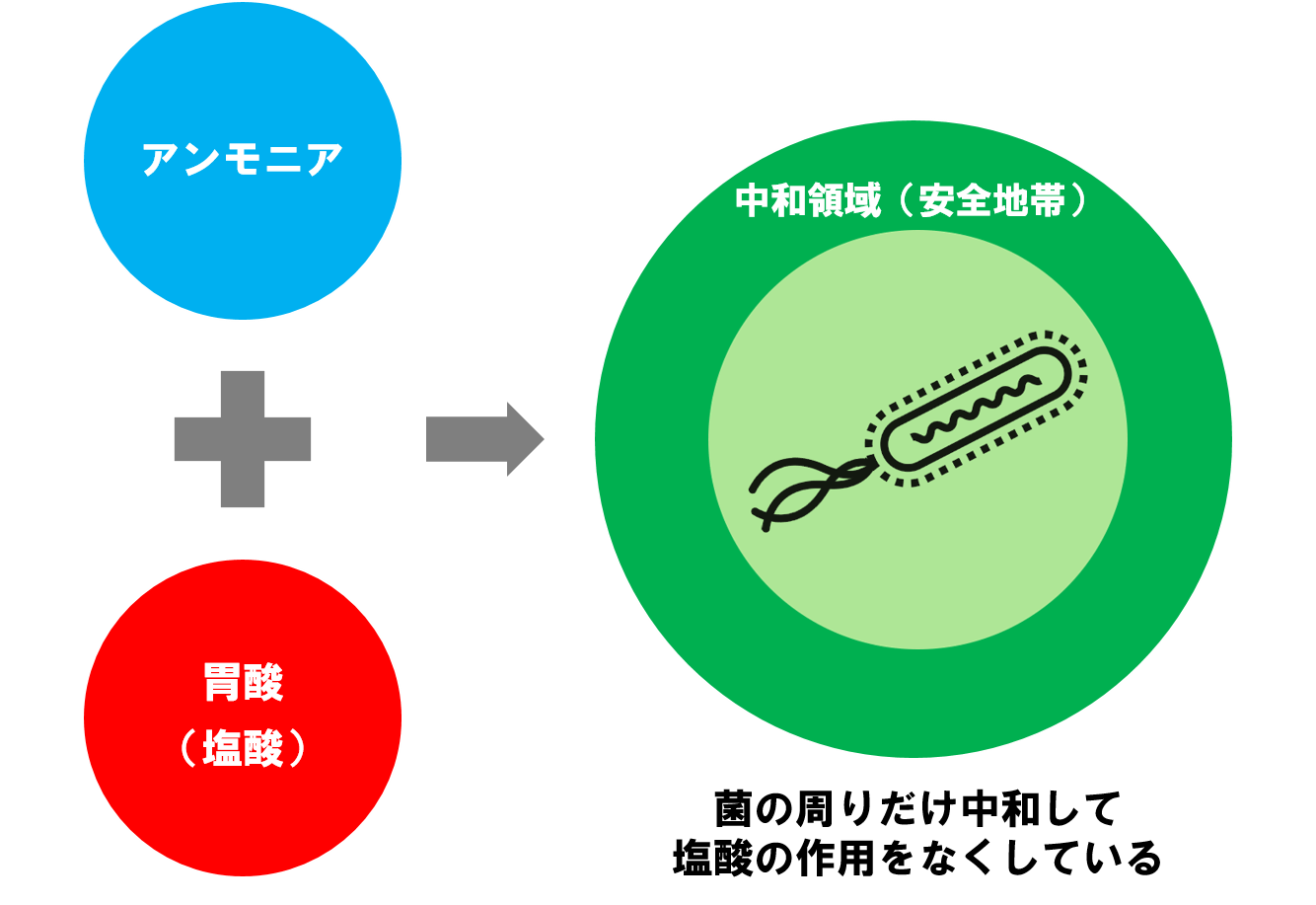 ピロリ菌は胃を住処(すみか)にする細菌(バクテリア)です。大きさは4マイクロメートル、小さいので肉眼では見えません。 ピロリ菌は過酷な環境で生き抜く賢い戦略をもっています。胃は胃液(塩酸)によって非常に強い酸性の環境なので、普通の細菌は住めません。 しかしピロリ菌は、ウレアーゼという酵素をつかって、尿素をアンモニアと二酸化炭素に変えて、そのうちのアンモニアと塩酸を反応させて自分の周りの部分の胃酸を中和します。